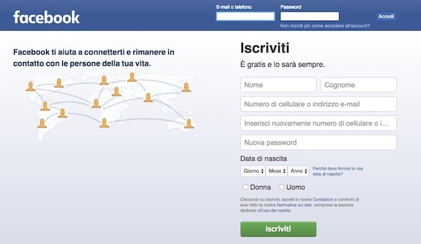 Dopo aver inserito anche la password con la quale intenderai accedere a Facebook, la tua data di nascita e il tuo sesso fai clic sul pulsante verde Iscriviti.