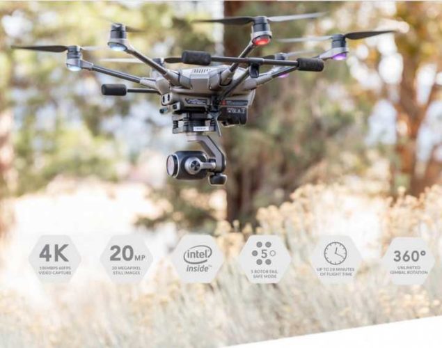 Yuneec Typhoon H è un esacottero che rientra a pieno diritto tra i migliori droni professionali. Pesa 1645 g, è dotato di sensori anti-ostacoli e camera 4K a 60 Fps, con sensore 1″ CMOS. La batteria 4S da 5250 mAh ha una autonomia di volo pari a 25 minuti ed un modello molto sicuro, grazie alle 6 eliche presenti.